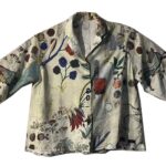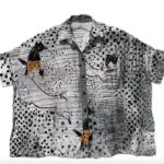 This butterfly style top has an interesting mix of geometric designs, flowers and animals. It has drop shoulders and short sleeves with shirred accent. Light weight, flowy and perfect for Spring and Summer.
