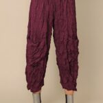 This top has a round neck-line, 3/4 length sleeves and an asymmetrical hem. It is made of crinkled embossed woven fabric.