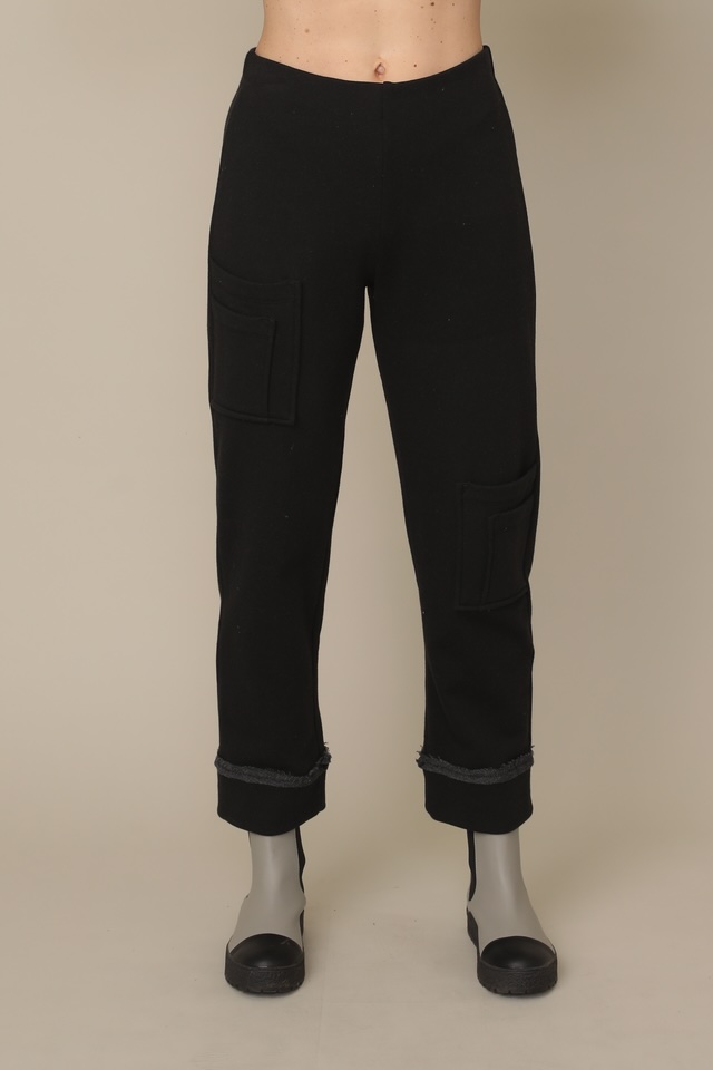 French Terry solid pant with an elastic waistband in a straight silhouette, raw edged cuffs, and an overlayed design of dynamically sized patch pockets