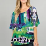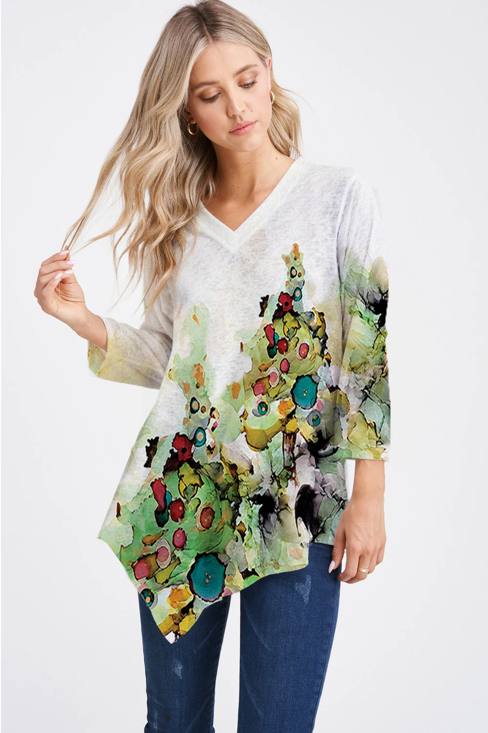 V-Neck, 3/4 length sleeves, asymmetrical hem