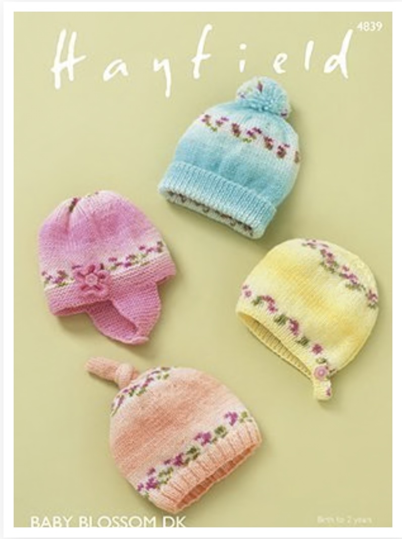 Booklet # 4839 features 4 hat patterns, each in 3 sizes.  Each pattern only takes 1 skein of the Hayfield Baby Blossom DK yarn.