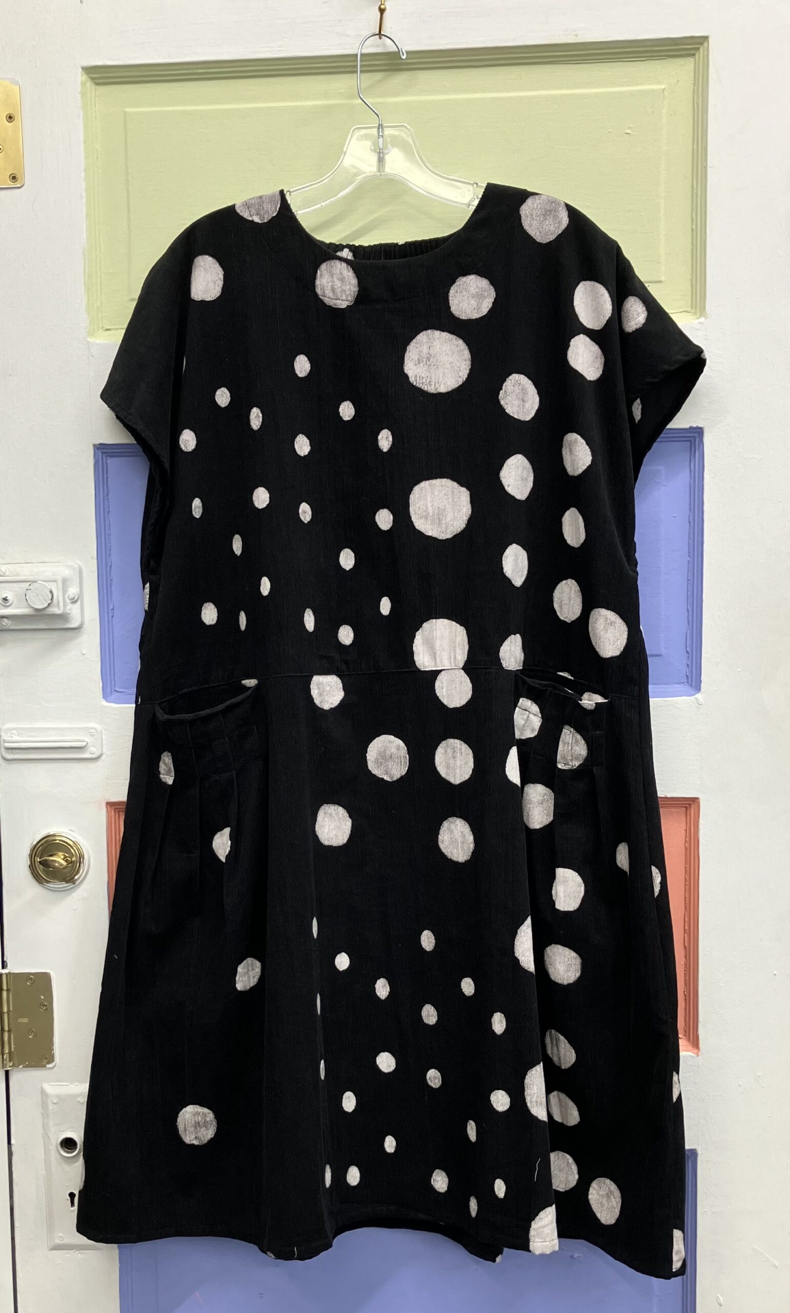100% cotton, pin cord dress with front patch pockets, short sleeves and round neckline.