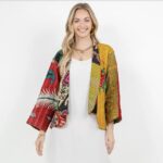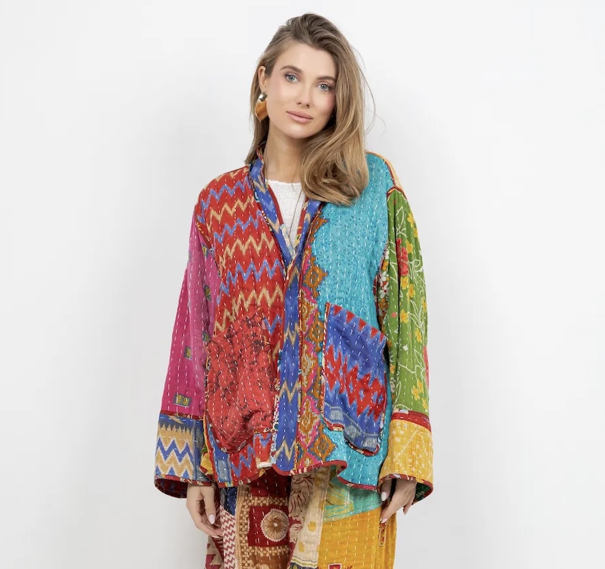 This is a reversible, kimono style jacket in a mix of patterns and colors, each one unique. Both sides have patch pockets.