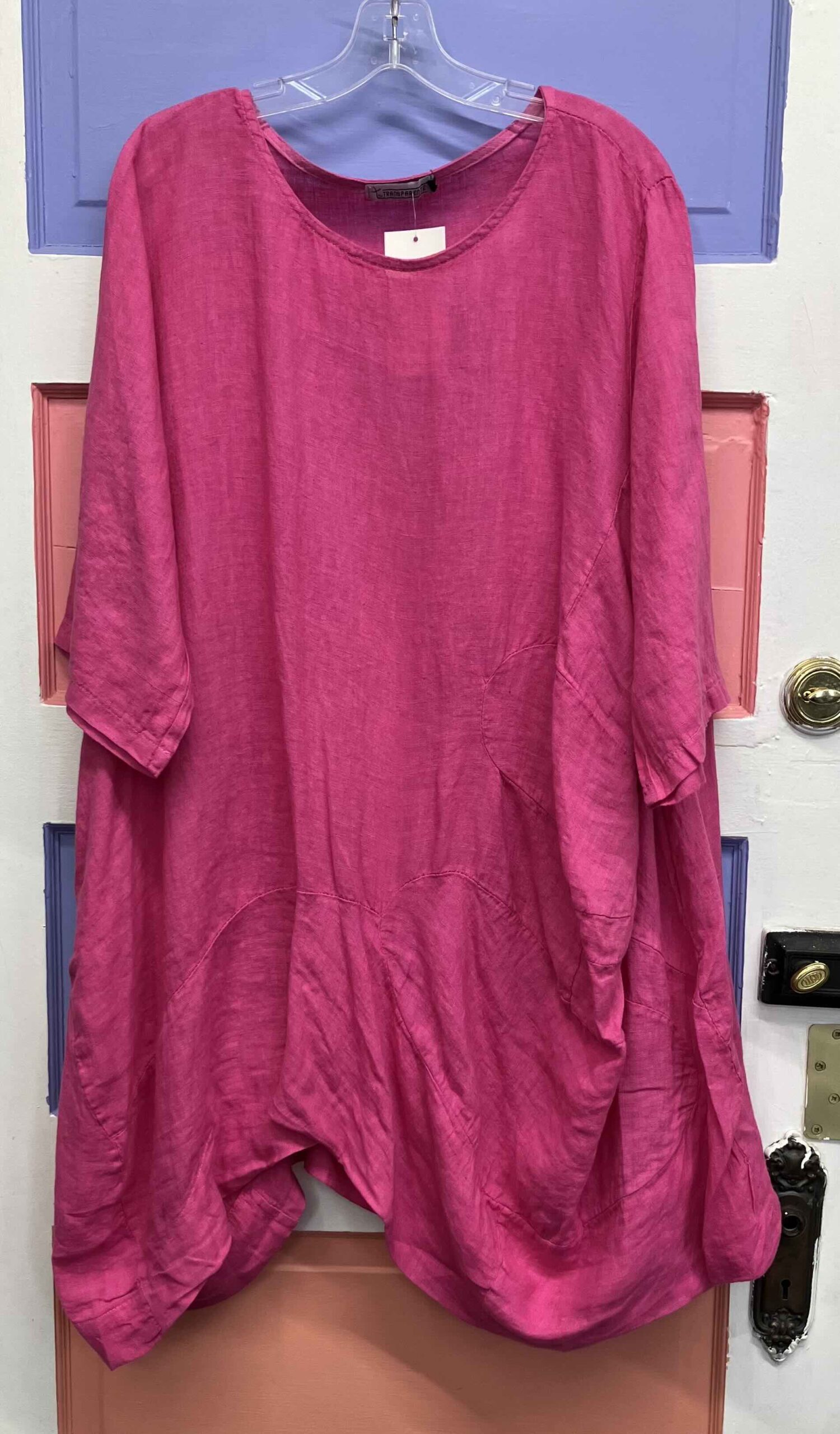 This is a tunic-length dress with an A-line silhouette with dropped three-quarter length sleeves. It features a seamed hemline, tuck detailing at the from and back to create a subtle bubble effect