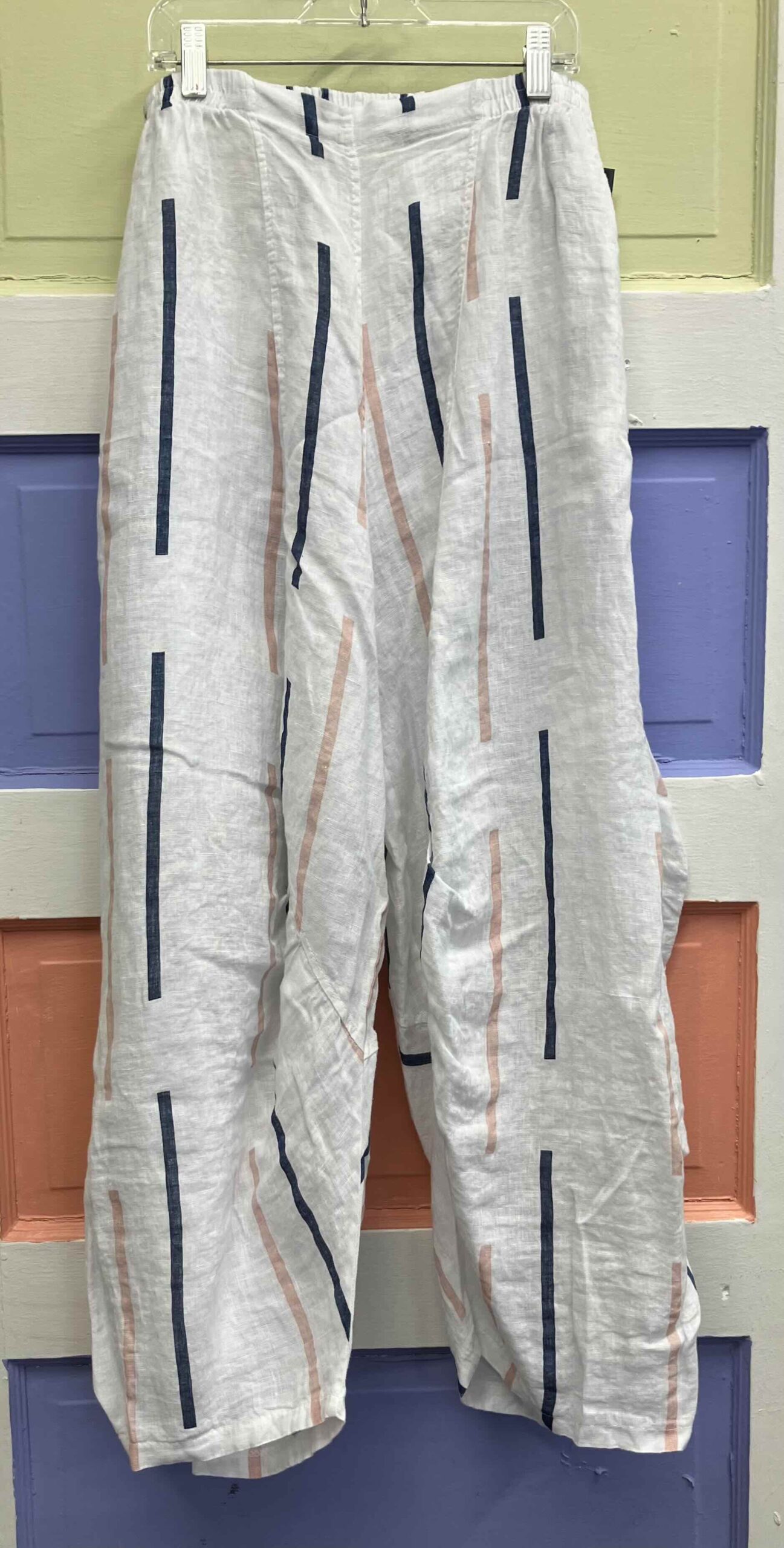 These white pants have a baggy silhouette, an elastic waistband and a soft stripe pattern for interest